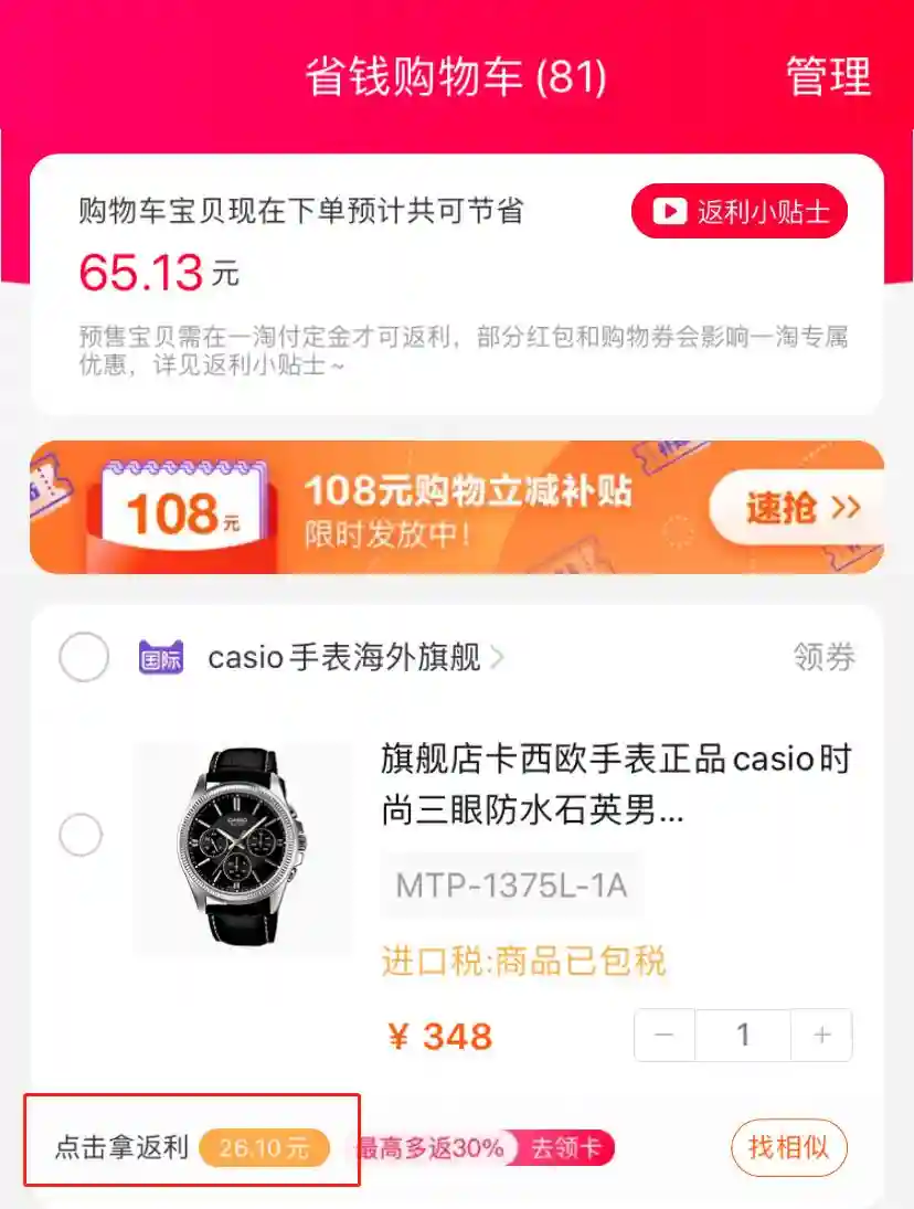 一淘能得到的返利:26.10元(注意:一淘的返利形势主要采取的是集分宝的行为哦!不是现金!)