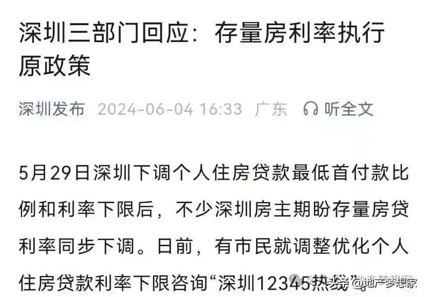 深圳存量房贷:6月4日,在端午节期间,“深圳发布”回应:《存量房利率执行原方案》,但是,截至日前,该文章已经删除,这也就意味着:存量房贷,迎来新的转机。