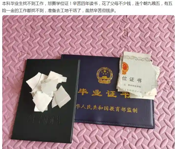 这也是本科教育跟高职教育的区分。有位男生却在屡次求职失败后,怒撕学位证。他发出这样的疑问:苦读这些年,也花了父母不少钱,怎么连个朝九晚五、五险一金的活也找不到?