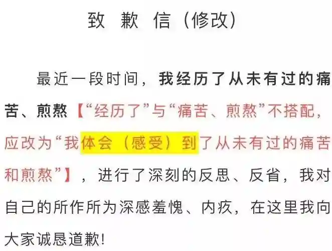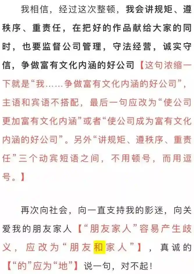 今天,我对自己的过错深感惶恐不安!我辜负了国家对我的培养,辜负了社会对我的信任,也辜负了影迷对我的喜爱!在此,我再次向大家诚恳道歉!请大家原谅!