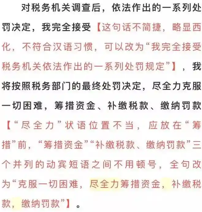 长期以来,由于自己没有摆正国家利益、社会利益和个人利益的关系,在影片《大轰炸》和其他一些合同中【“影片《大轰炸》”不是合同,二者不能并列,应改为“在影片《大轰炸》和其他影片的一些合同中”】出现利用“拆分合同”等逃税问题【“利用”缺宾语,应改为“出现利用拆分合同等方式逃税问题”】,我深感羞愧。这些天在配合税务机关对我及我公司的税务检查中,我一直深刻反省:作为一个公众人物,应该遵纪守法,起到社会和行业的模范带头作用,不应在经济利益面前,丧失自我约束,放松管理,以致违法失守。在此,我诚恳地向社会、向爱护关心我的朋友,以及大众,向国家税务机关道歉【这一句逻辑关系不清,“社会、朋友、大众、国家税务机关”能否并列,如何排序,都有问题,修改需要伤筋动骨,暂且稍改得顺畅一点:我诚恳地向社会、向大众、向关心爱护我的朋友、向国家税务机关道歉】。