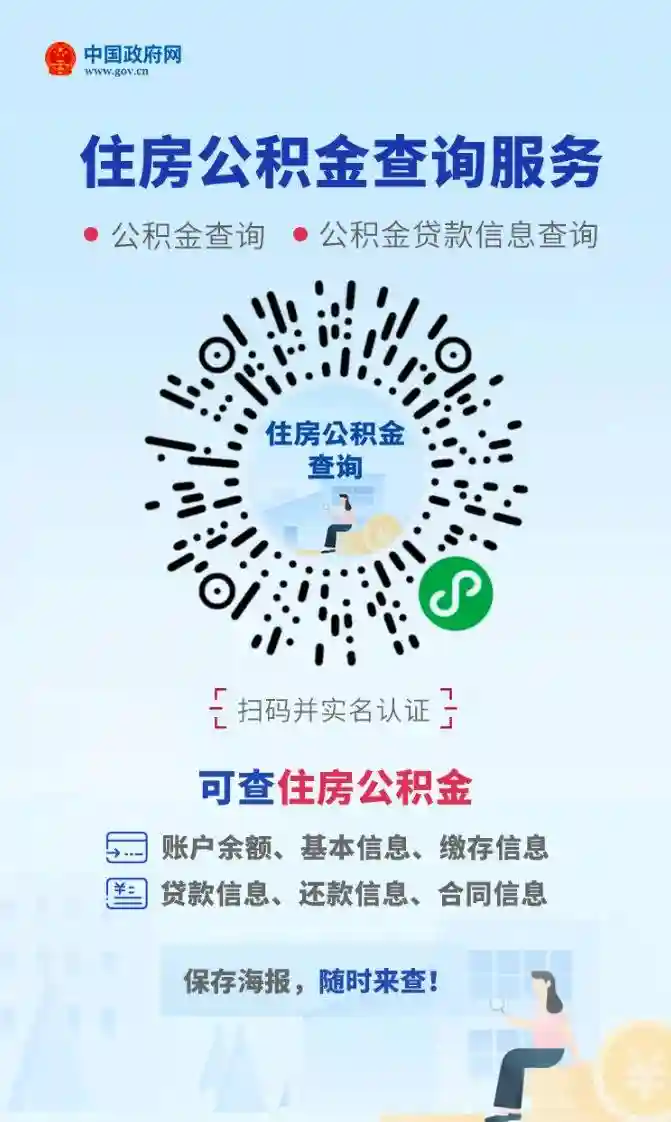 为方便查询个人公积金账户余额,由住房和城乡建设部提供的“住房公积金查询服务”(以下简称“服务”)在国务院客户端小程序今日正式上线。个人可扫描海报小程序码进行实名认证。通过“服务”可直接查询个人公积金账户余额、缴存单位、个人和单位的缴存比例、缴存额。同时还可通过“服务”获取公积金贷款信息,包括:个人信息、还款信息、合同信息,还款方式、贷款余额、合同编号等。