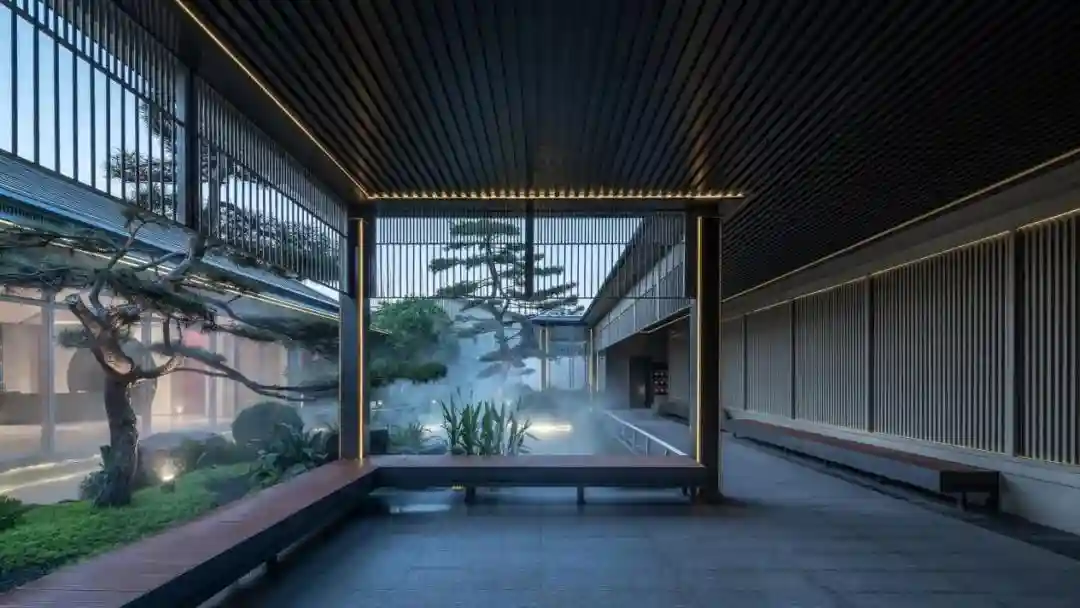 简约利落的线条+大面积玻璃令建筑整体质感更加通透,局部挑檐为中式屋檐,一半传承,一半当下,走出了一条古韵新雅的美学之路。