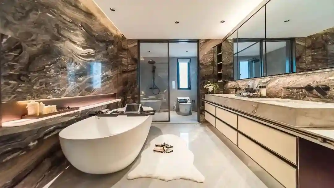 再上二层,可设计成2-3间卧室。主卧星级套房设计,推开双开门,迎面便是女王衣帽间,主卧开间达到约6.9米,配置有双台盆、独立浴缸、干湿分离四大空间,星级酒店感拉满。