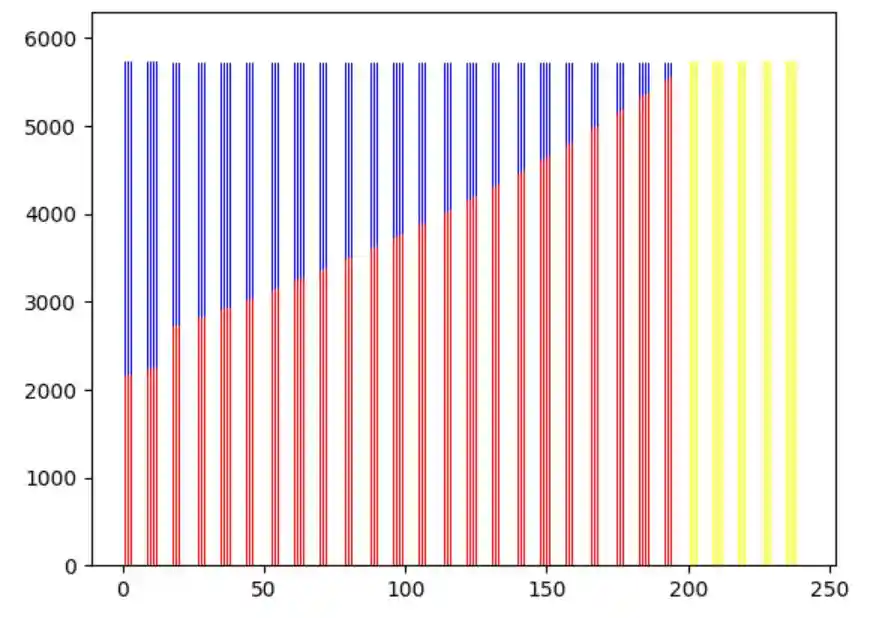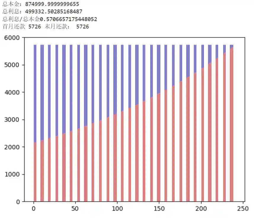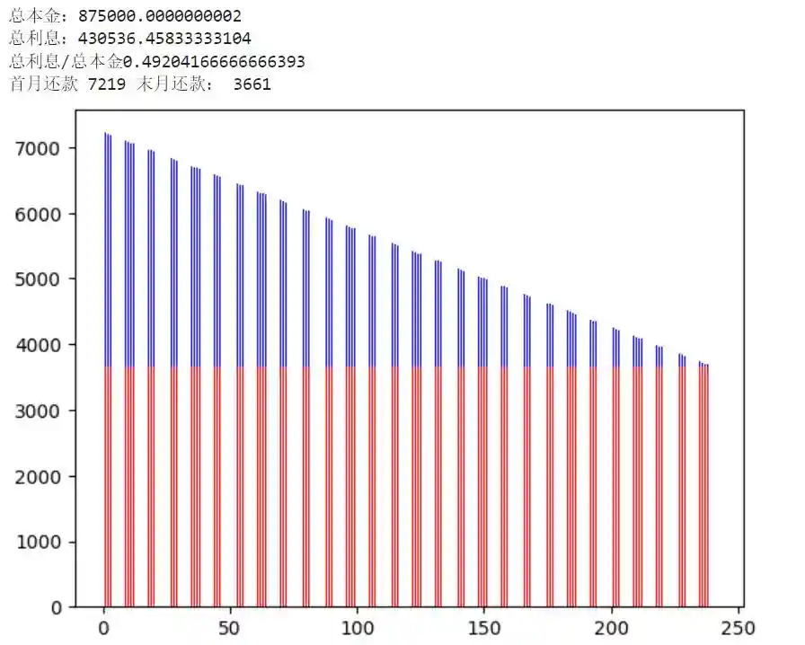 importnumpyasnpdefprintStatistics(capitals,interests,total_payment,months):print("总本金:"+str((capitals)))print("总利息:"+str((interests)))print("总利息/总本金"+str((interests)/(capitals)))print("首月还款%.2f末月还款:%.2f"%(total_payment[0],total_payment[months-1]))defdrawDiagram(months,fn,*args,**kwargs):capitals,interests,total_payment=fn(months,*args,**kwargs)printStatistics(capitals,interests,total_payment,months)month_array=(1,months+1,1)height=(month_array,capitals,width=0.2,align='center',color='red')(month_array,interests,width=0.2,align='center',color='blue',bottom=capitals)()再跑一下知乎的例子,绘制等额本金和等额本息的还款柱状图: