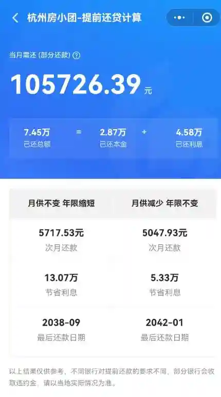 如图,缩短了40个月(3年4个月)账期,次月还款额以及节省利息等都与小程序计算一致。