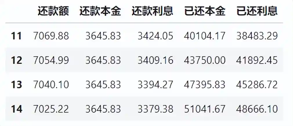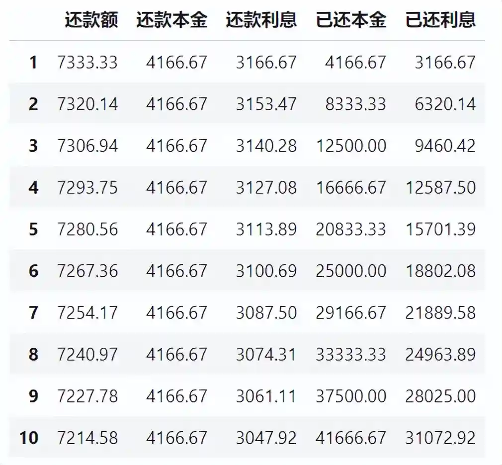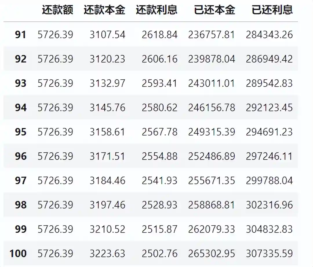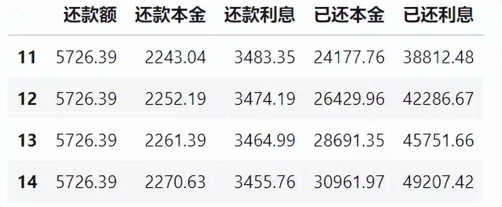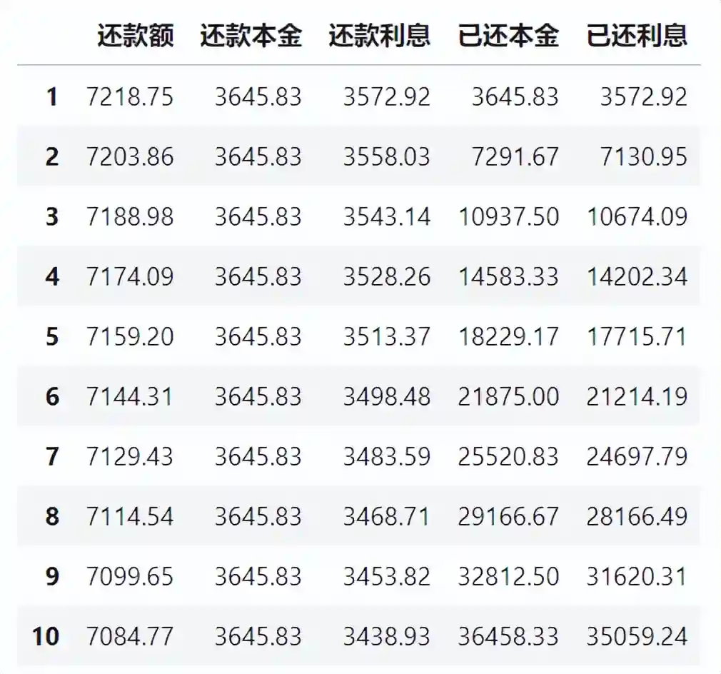importpandasaspddefdrawTable(months,fn,*args,**kwargs):capitals,interests,total_payment=fn(months,*args,**kwargs)paid_capital=[0]*monthspaid_interests=[0]*monthspaid_capital[0]=capitals[0]paid_interests[0]=interests[0]forxinrange(1,months):paid_capital[x]=paid_capital[x-1]+capitals[x]paid_interests[x]=paid_interests[x-1]+interests[x]origin=([total_payment,capitals,interests,paid_capital,paid_interests])(,columns=['还款额','还款本金','还款利息','已还本金','已还利息'],index=(1,months+1))