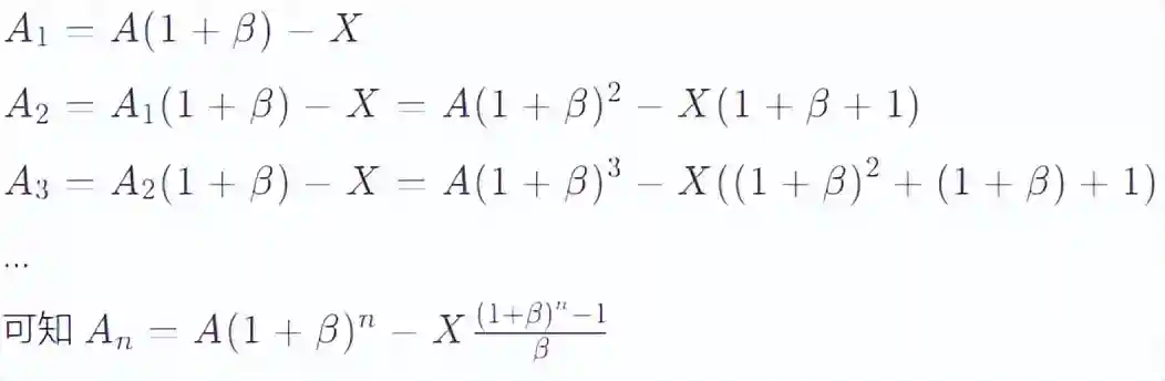 等额本息的计算方法有些复杂,参考用Python深度解读房贷利率文中的解法,设A为本金,第i个月月末所欠银行本金为Ai,每月所还贷款总额为X,月利率为β,则有: