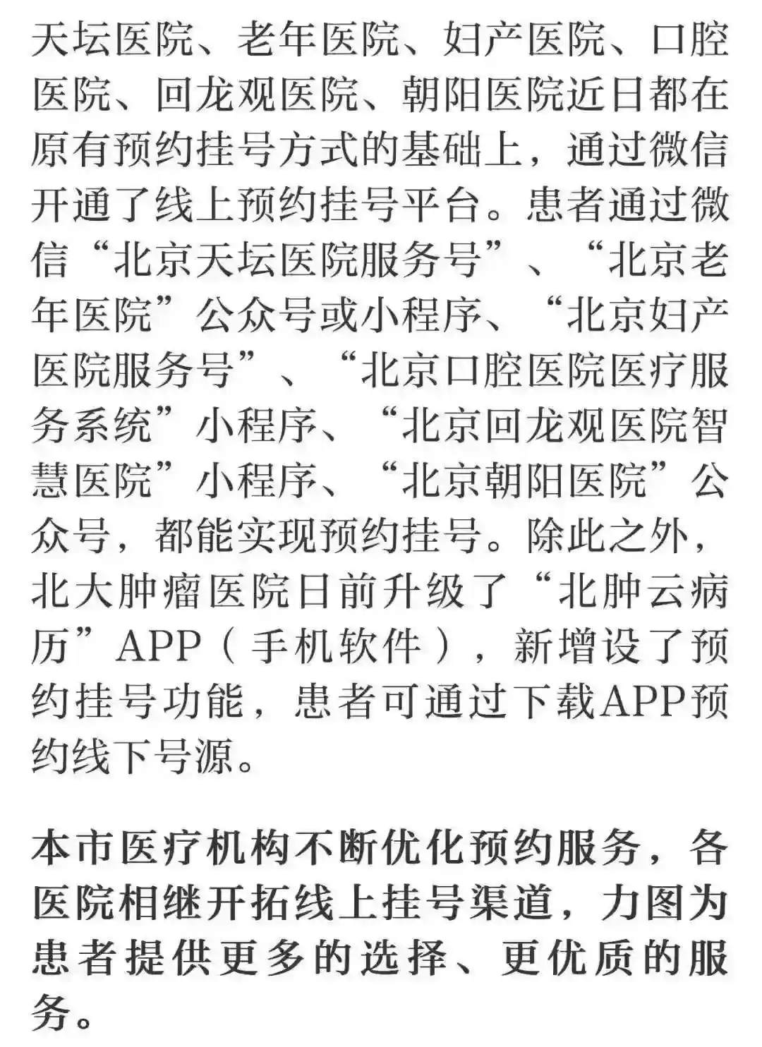 为更好地服务患者,北京多家医院近日畅通多种预约渠道,通过微信上线或升级预约挂号服务平台。