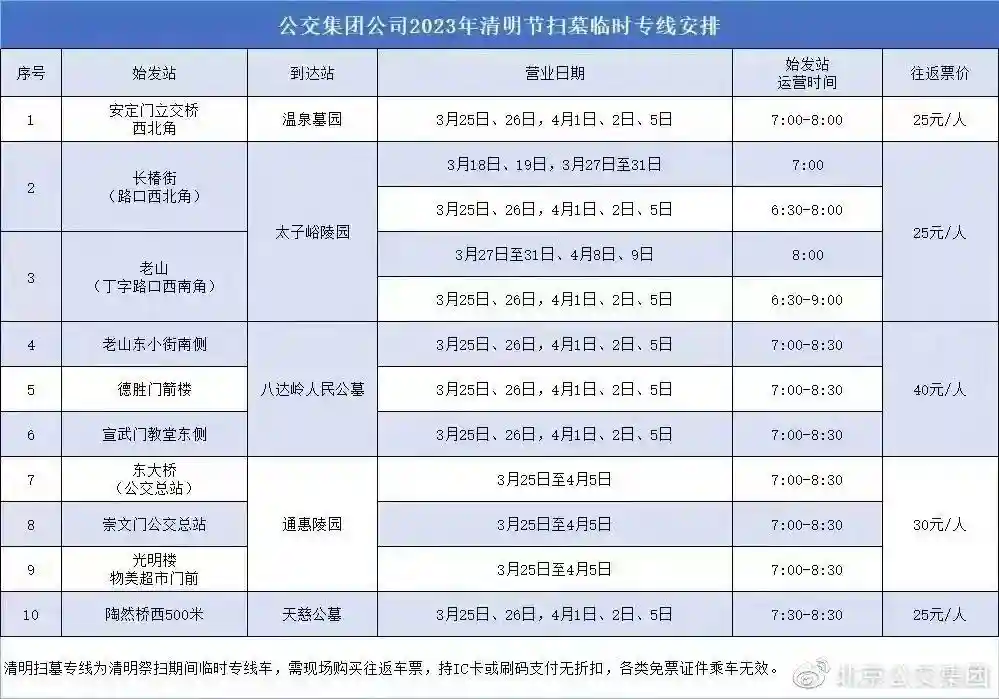 2025年清明祭扫期间,北京公交集团开通10条由市区直达5处陵园墓地的清明扫墓专线。