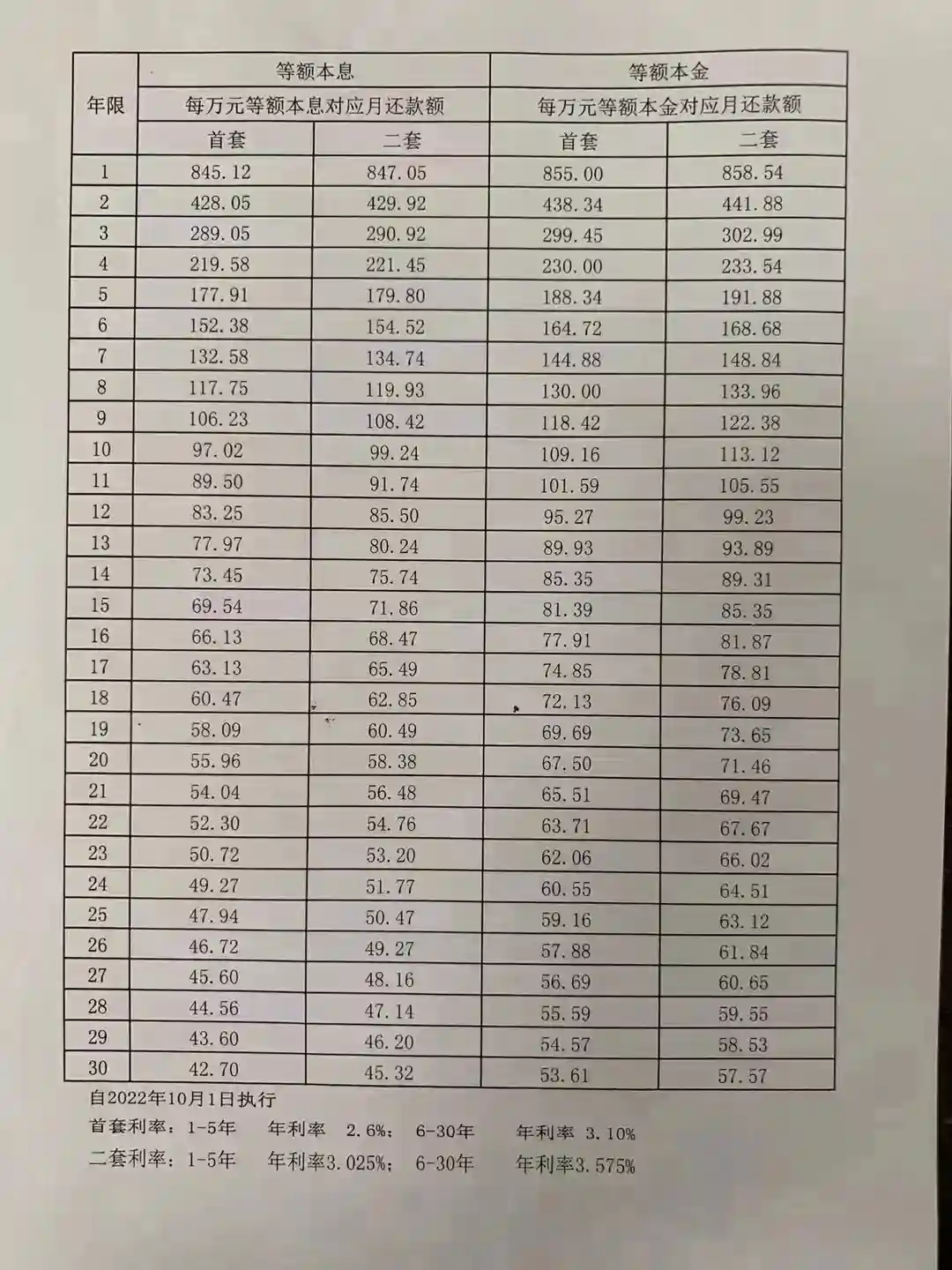 对应年限的万元贷款额利率