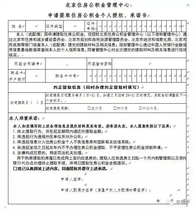 北京住房公积金管理中心此前发布的《关于取消住房公积金提取业务纸质申请表及部分业务网上办结的公告》中规定:从1月10日起,购买北京市行政区域内住房申请提取公积金的,可以申请人自己办理提取,也可以单位经办人办理。